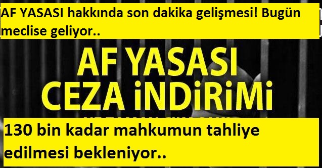 Yüzbinlerce kişiyi ilgilendiren af yasası hakkında son dakika bilgileri peş peşe geliyor! Kamuoyunca af yasası olarak bilinen ceza infaz yasası bugün TBMM'ye geliyor. Geçtiğimiz hafta AK Parti Grup Başkanvekili Cahit Özkan geçen hafta yaptığı açıklamada yüzbinlerce mahkumu ilgilendiren paketin bugün meclise geleceğini ifade etmişti. Uyuşturucu suçlarına af gelecek mi? Kimler açık cezaevinden tahliye edilecek? 100 bin kadar mahkumu evine göndermeyi planlayan kanun teklifi sonucunda hangi mahkumlar tahliye edilecek? İşte son dakika gelişmeleri...