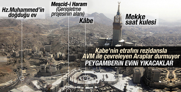 Habere göre, kentin ve Kabe'nin etrafını gökdelenlerle dolduran Suudi yönetimi Hz. Muhammed'in doğduğu evi yıkacak ve Kabe'nin etrafındaki alana rezidans ve AVM yapacak.