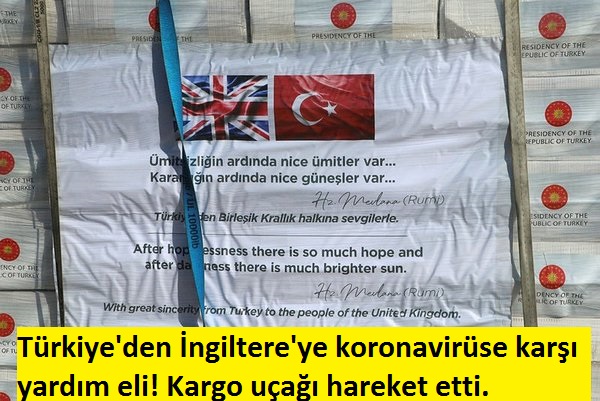 Türkiye, koronavirüsle mücadele eden İngiltere'ye askeri kargo uçağı 'Koca Yusuf' ile bez maske, N95 maske ve tulum gönderdi. Yardım paketlerinin üzerinde Hz. Mevlana'nın, 'Ümitsizliğin ardında nice ümitler var, karanlığın ardında nice güneşler var' sözü yer aldı.