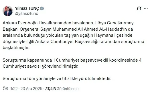 Ankara Esenboğa Havalimanından havalanan, Libya Genelkurmay Başkanı Orgeneral Sayın Muhammed Ali Ahmed AL-Haddad’ın da aralarında bulunduğu yolcuları taşıyan uçağın Haymana ilçesinde düşmesiyle ilgili Ankara Cumhuriyet Başsavcılığı tarafından soruşturma başlatılmıştır.