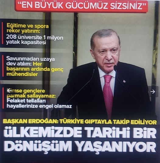 Türkiye her alanda büyük atılım içinde Başkan Recep Tayyip Erdoğan, Beştepe Millet Sergi Salonu’nda Gençlik ve Spor Bakanlığı yurtlarında kalan öğrenciler, sporcular ve gençlerle düzenlenen iftar programında bir araya gelerek gençliğin Türkiye’nin geleceğindeki rolüne vurgu yaptı. Erdoğan, Türkiye Yüzyılı hedeflerinin gençlerin omuzlarında yükseleceğini belirterek savunma sanayisinden teknolojiye, eğitimden spora kadar yapılan yatırımlarla gençlerin her alanda desteklendiğini ifade etti; birlik, kardeşlik ve milli değerlere sahip çıkma çağrısında bulundu.