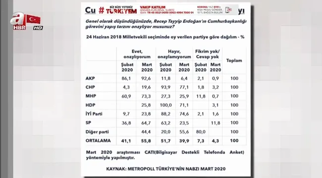 Başkan Recep Tayyip Erdoğan'ın koronavirirüs ile mücadeledeki başarısı anket sonuçlarına da yansıdı. Metropoll araştırma şirketi tarafından yapılan ankete katılanların yüzde 55.8'i "Erdoğan'ı destekliyoruz" dedi. Bu süreçte Başkan Erdoğan'a muhalefet partilerine oy veren seçmenden de büyük destek var..