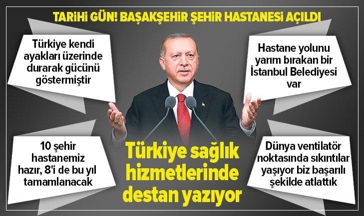 BAŞKAN ERDOĞAN'DAN BAŞAKŞEHİR ŞEHİR HASTANESİ'NİN AÇILIŞINDA FLAŞ MESAJLARSon dakika haberi... Başkan Erdoğan, video konferansla 'nin ilk etabının açılışı ve yerli solunum cihazı teslim törenine katılıyor. Sağlık Bakanı Koca açılışta yaptığı konuşmada "Başakşehir Şehir Hastanemiz bütünüyle 15 Mayıs'ta faaliyete geçecektir. İstanbulumuz, iki yakadaki şehir hastanelerimizle birlikte sağlık altyapısı bakımından da dünyanın en başta gelen şehri olacaktır." dedi.