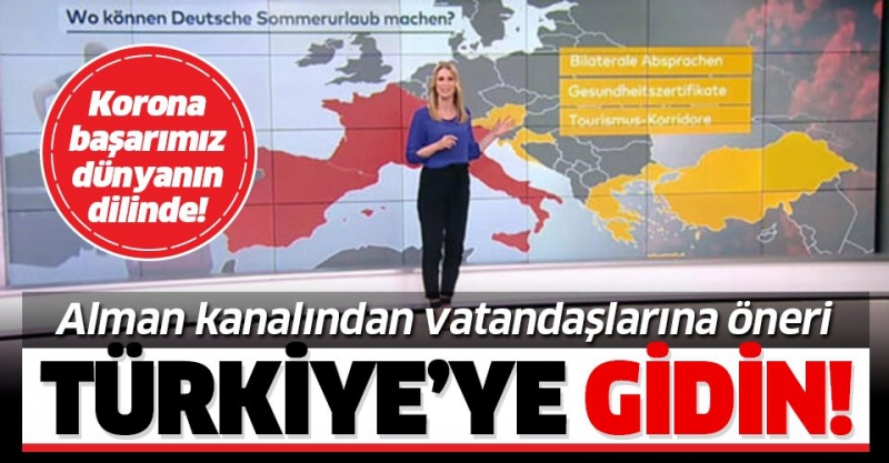 Alman televizyonu vatandaşların yaz tatili için Türkiye'ye gitmesini önerdi. Almanlar tarafından da önemli bir merkez olan Türkiye’yi öne çıkaran Die Welt, ülkede görülen vaka sayıları düşmesiyle ülkenin, bu sezonda da tercih edileceğinin öngörüldüğünü söyledi.
