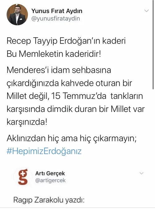 AK Parti İstanbul İl Başkan Yardımcısı Yunus Fırat Aydın da; "Recep Tayyip Erdoğan'ın kaderi bu memleketin kaderidir! Menderes'i idam sehbasına çıkardığınızda kahvede oturan bir millet değil, 15 Temmuz'da tankların karşısında dimdik duran bir millet var karşınızda! Aklınızdan hiç ama hiç çıkarmayın; Hepimiz Erdoğanız" dedi.