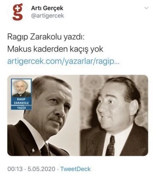 CHP Grup Başkanvekili ve Manisa Milletvekili Özgür Özel ve CHP İstanbul İl Başkanı Canan Kaftancıoğlu'nun ardından şimdi de Evrensel Gazetesi yazarı Ragıp Zarakolu, Cumhurbaşkanı Recep Tayyip Erdoğan’ı hedef aldı. Ragıp Zarakolu; ArtıGerçek internet sitesinde, 10 yıl süreyle başbakanlık yapan ve darbeciler tarafından idam edilen Adnan Menderes ile Cumhurbaşkanı Recep Tayyip Erdoğan’ı kıyasladı ve “Makus kaderden kaçış yok” iddiasında bulundu. ArtıGerçek sitesi; Almanya’nın Köln şehrinden yayın yapıyor ve genel yayın yönetmenliğini Celal Başlangıç’ın yapıyor.
