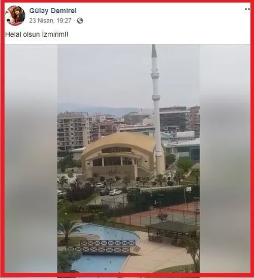 CHP İstanbul Büyükşehir Belediyesi ve Beykoz Belediye Meclis Üyesi Gülay Demirel, sosyal paylaşım sitesi Facebook hesabından, İzmir'de Karşıyaka ilçesine bağlı İhsan Gültekin Camii'nin minaresinden çalındığı iddia edilen İzmir Marşı'nı "Helal olsun İzmirim" ifadeleriyle paylaştı.