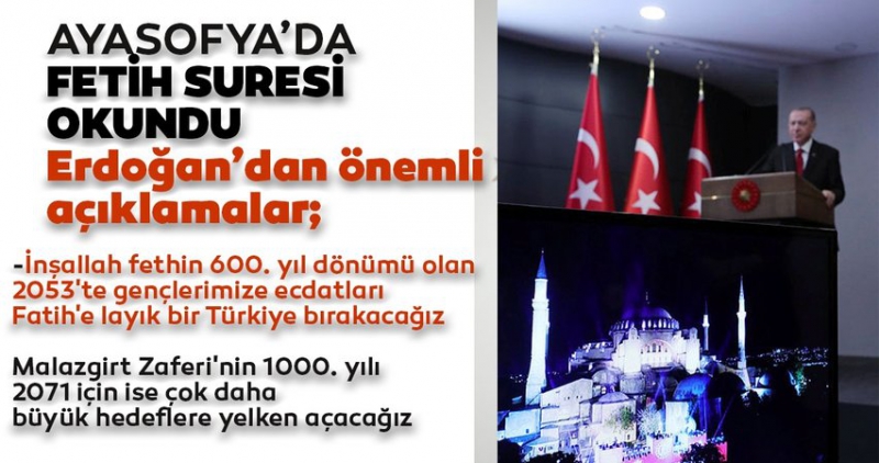 Fethin 567. yıl dönümünün Fatih'in emaneti Ayasofya'da Fetih Suresi okunmak ve dualar edilmek suretiyle yad edilmesi çok önemli. Kendi hayatımızı da bu şehre adadık. Büyükşehir Belediye Başkanı, Başbakan ve Cumhurbaşkanı olarak bu şehre yaptığımız her hizmet bizim için hem bu dünyada hem öteki dünyada birer berat belgesidir. İnşallah fethin 600. yıl dönümü olan 2053'te gençlerimize ecdatları Fatih'e layık bir Türkiye bırakacağız. Fatih'in izinden giderek asıl olanın gönüllerin fethi olduğu anlayışıyla hep gönülleri yapmak, gönüller kazanmak için çalıştık. Malazgirt Zaferi'nin 1000. yılı 2071 için ise çok daha büyük hedeflere yelken açacağız.