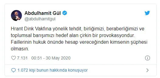 Adalet Bakanı Abdulhamit Gül, dün yaptığı paylaşımda "Hrant Dink Vakfı'na yönelik tehdit, birliğimizi, beraberliğimizi ve toplumsal barışımızı hedef alan çirkin bir provokasyondur. Faillerinin hukuk önünde hesap vereceğinden kimsenin şüphesi olmasın" ifadelerini kullanmıştı.