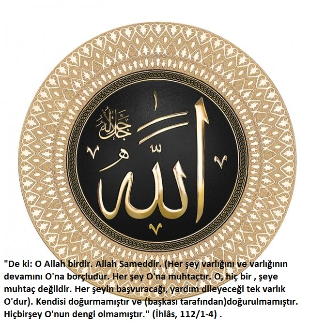 a) "De ki: O Allah birdir. Allah Sameddir. (Her şey varlığını ve varlığının devamını O'na borçludur. Her şey O'na muhtaçtır. O, hiç bir , şeye muhtaç değildir. Her şeyin başvuracağı, yardım dileyeceği tek varlık O'dur). Kendisi doğurmamıştır ve (başkası tarafından)doğurulmamıştır. Hiçbirşey O'nun dengi olmamıştır." (İhlâs, 112/1-4) .