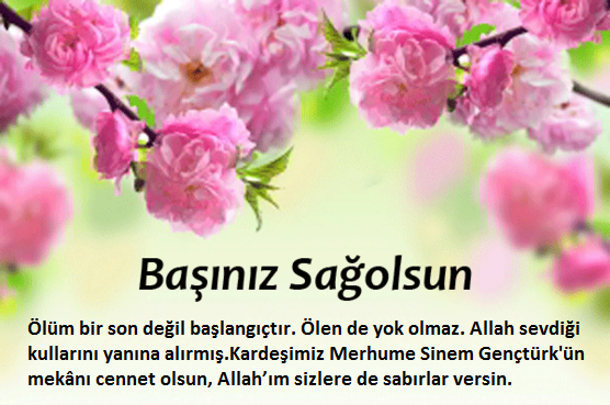 Manisa Turgutlu Ketenci Sitesi sakinlerinden, Gökhan Gençtürk'ün Eşi Sinem Gençtürk Vefat etmiştir. Merhumenin cenazesi bugün 07 Haziran 2020 Pazar günü Saat 19,30 da kılınacak olan cenaze namazının ardından Turgutlu mezarlığında toprağa verilecektir..
