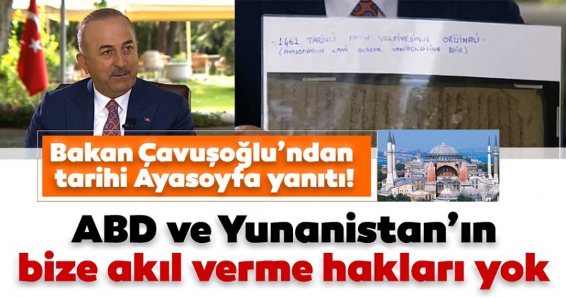 Bakan Çavuşoğlu canlı yayın sırasında Fatih Sultan Mehmet'in vasiyetini ve Ayasofya'nın tapusunu göstererek "Bakın burada belgesi var. Fatih'in vasiyeti ve vakfiyesi var. Evet bu yapılar tüm insanlığındır. Ama nasıl değerlendirileceğine biz karar veririz. ABD ve Yunanistan'ın bize akıl verme hakları yok. İnanç özgürlüğünde nerede olduklarını biliyoruz" dedi.