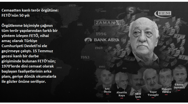 Örgütlenme biçimiyle çağının tüm terör yapılarından farklı bir yöntem izleyen FETÖ, nihai amaç olarak Türkiye Cumhuriyeti Devleti’ni ele geçirmeye çalıştı. 15 Temmuz gecesi kanlı bir darbe girişiminde bulunan FETÖ’nün; 1970’lerde dini cemaat olarak başlayan faaliyetlerinin arka planı, geriye dönük okumalarla ile gözler önüne seriliyor.