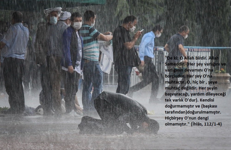 "De ki: O Allah birdir. Allah Sameddir. (Her şey varlığını ve varlığının devamını O'na borçludur. Her şey O'na muhtaçtır. O, hiç bir , şeye muhtaç değildir. Her şeyin başvuracağı, yardım dileyeceği tek varlık O'dur). Kendisi doğurmamıştır ve (başkası tarafından)doğurulmamıştır. Hiçbirşey O'nun dengi olmamıştır." (İhlâs, 112/1-4)