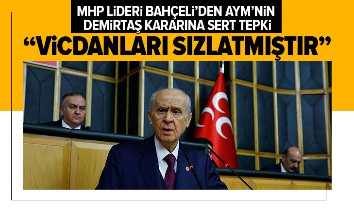 Son dakika haberi... MHP Genel Başkanı Bahçeli: En son, terörist Demirtaş ile ilgili hak ihlali kararı verilmesi, üstelik Türk devletinin 50 bin lira tazminat ödemesine hükmedilmesi haklı olarak vicdanları sızlatmıştır. Adalet suçu aklamak, suçluyu temize çıkarmak değil, hak ve hukuk neyi öngörüyorsa aynen yapmaktır..