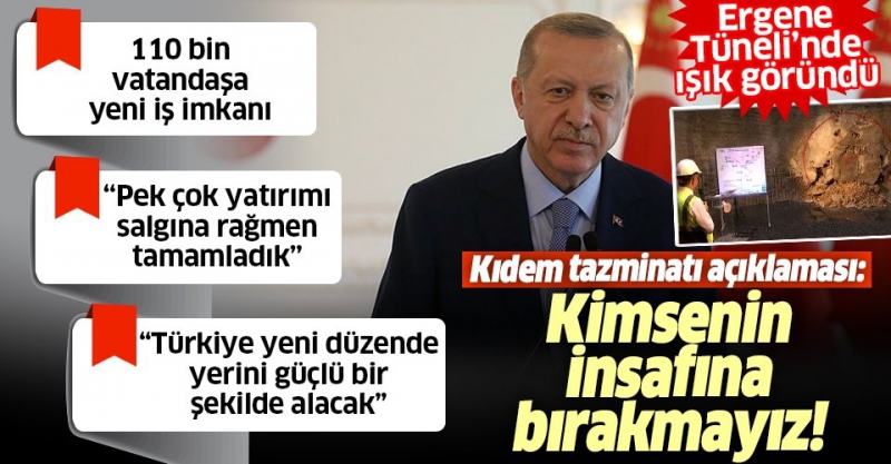 Son dakika haberine göre Başkan Recep Tayyip Erdoğan video konferans yöntemiyle ''Ergene Çevre Koruma Projesi, Derin Deşarj Hattı B Tüneli Işık Göründü Merasimi''nde konuştu. Başkan Erdoğan, "Bölgedeki yerel yönetimler maalesef senelerce bu havzanın (Ergene) korunması konusunda gereken hassasiyeti göstermedi." dedi. Kıdem tazminatıyla ilgili de önemli açıklamalar da bulunan Erdoğan, "Birilerinin insafına bırakılmayacak" ifalerini kullandı.
