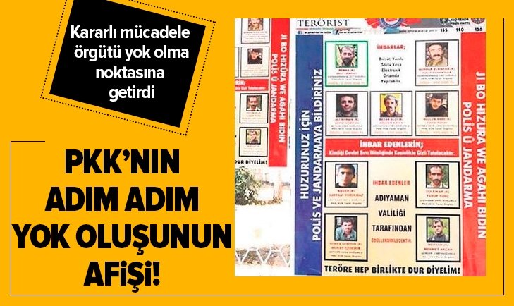 Türkiye’nin PKK’lı teröristlere karşı son yıllarda verdiği mücadele örgütü yok olma noktasına getirdi. Adıyaman polisinin 2016’da "Teröre hep birlikte dur diyelim" sloganıyla görenlerin ihbar etmesi için fotoğraflarını afişle sokaklara astığı 9 azılı teröristten 7’si öldürüldü, 1’i aç kalınca dağdan indiği kent merkezinde yakalandı..