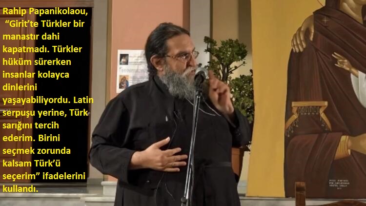 Rahip Papanikolaou, “Girit’te Türkler bir manastır dahi kapatmadı. Türkler hüküm sürerken insanlar kolayca dinlerini yaşayabiliyordu. Latin serpuşu yerine, Türk sarığını tercih ederim. Birini seçmek zorunda kalsam Türk’ü seçerim” ifadelerini kullandı.