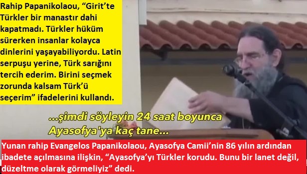 Rahip Papanikolaou, “Girit’te Türkler bir manastır dahi kapatmadı. Türkler hüküm sürerken insanlar kolayca dinlerini yaşayabiliyordu. Latin serpuşu yerine, Türk sarığını tercih ederim. Birini seçmek zorunda kalsam Türk’ü seçerim” ifadelerini kullandı.