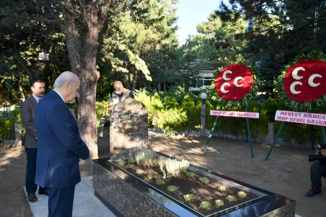 Merhum 'in Beştepe'deki mezarını ziyaret eden Bahçeli, Türkeş'in kabrine kırmızı ve beyaz karanfiller bıraktı, bakır ibrikle su döktü.