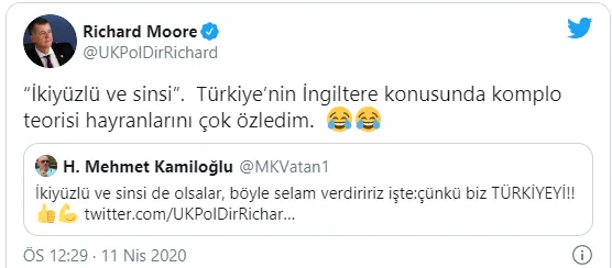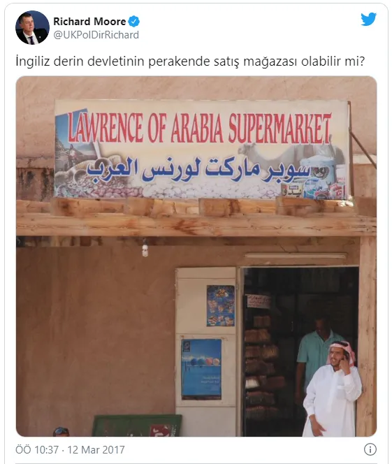 ALAN DUNCAN ilk yardıma koşandı... Şimdi MI6'in tepesinde olan İngiltere  Moore ilk röportajı veren isimdi..." Evet... Yaklaşık 2 yıl önce Ankara'da görev yapan ve kendisini SOSYAL MEDYADAN çok sevdiren İngiltere'nin ANKARA BÜYÜKELÇİSİ Richard Moore'un MI6'in başına geçtiğini yazmışım... Ankara günleri bittikten sonra İNGİLİZ İSTİHBARATININ PATRONU oldu. Bunda şaşılacak bir şey yoktu. Sadece ben önceden buraya taşımışım. Burada görev yaptığı hatta Türkiye'ye ilk geldiği 1990'lardan itibaren ANADOLU'yu iyi bilen bir isimdi MOORE... Eski BÜYÜKELÇİ şimdiki İSTİHBARAT patronu Moore'un pek çok açıklamasını başka önemli isimler gibi yakından takip ettim.