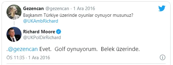 Takvim gazetesi yazarı , geçtiğimiz günlerde MI6’in başına getirilen ’nin  Büyükelçisi ’un  hain darbe girişiminin ardından yaptığı açıklamalara dikkat çekti. Diler, hain darbe girişiminin ardından ilk gelenin İngiliz Bakan  olduğunu hatırlatarak, Moore’un "Hayır, kesinlikle biz darbenin içinde yokuz. Bu arada, ABD de yok” ifadelerini kullandığını yazdı. Diler öte yandan Moore’un bir başka açıklamasının çok daha dikkat çekici olduğunu söyledi. Diler, “Moore "Şunu anımsatmak isterim İngiltere Parlamentosu en son Hitler tarafından bombalanmıştı..." sözleriyle savaşın tarifini, taraflarını ve şiddetini anlatıyordu... İngiltere ve HİTLER örneğini vererek "15 TEMMUZ'un arkasında  var" diyordu” diye yazdı.