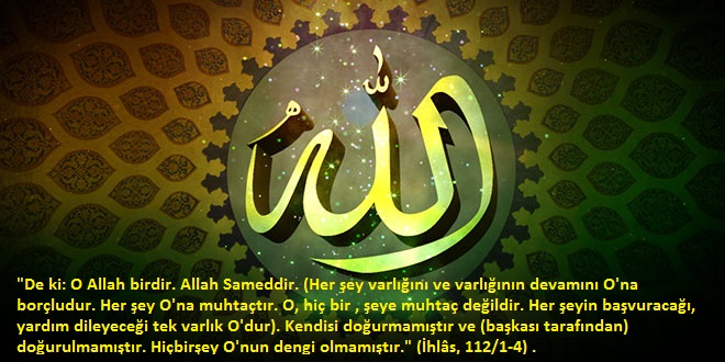 "De ki: O Allah birdir. Allah Sameddir. (Her şey varlığını ve varlığının devamını O'na borçludur. Her şey O'na muhtaçtır. O, hiç bir , şeye muhtaç değildir. Her şeyin başvuracağı, yardım dileyeceği tek varlık O'dur). Kendisi doğurmamıştır ve (başkası tarafından)doğurulmamıştır. Hiçbirşey O'nun dengi olmamıştır." (İhlâs, 112/1-4) .