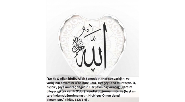 a) "De ki: O Allah birdir. Allah Sameddir. (Her şey varlığını ve varlığının devamını O'na borçludur. Her şey O'na muhtaçtır. O, hiç bir , şeye muhtaç değildir. Her şeyin başvuracağı, yardım dileyeceği tek varlık O'dur). Kendisi doğurmamıştır ve (başkası tarafından)doğurulmamıştır. Hiçbirşey O'nun dengi olmamıştır." (İhlâs, 112/1-4) .