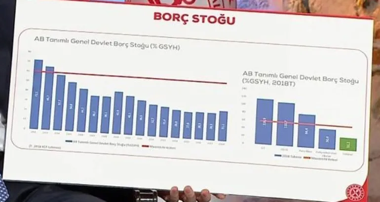 Bir kişinin, kurumun, devletin sağlık-sıhhatı iyi mi diye soduğunuzda borç ve geliri ne bunu görmek gerek. Borç düzeyine bakınca dünyada ne düzeyde. Buna bakacağız ki Türkiye'nin mevcut durumunu anlayalım. Gelişmekte olan ülkeler yüzde 50 Türkiye yüzde 30. Avrupa Birliği ülkelerinin borcu yüzde 84. Türkiye'nin borcu konusunda sıkıntısı yok.