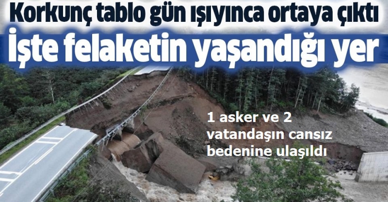 Tirebolu-Doğankent karayolunda menfezin çökmesi sonucu içinde bulundukları araçla dereye düşerek kaybolan 5 jandarma görevlisi ile bir iş makinesi operatörü olmak üzere 6 kişinin sulara kapıldığı alan havadan görüntülenirken, yoldaki kopmanın boyutu gün ağarınca ortaya çıktı. Günün ilk ışıkları ile kayıp 6 kişiyi arama çalışmaları ise sürerken, jandarma aracının da toprak altında kaldığı gözlendi.