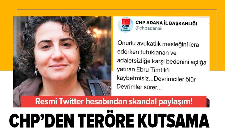 Cumhuriyet Halk Partisi Adana İl Başkanlığı'nın resmi twettır hesabından Timtik'i kutsayan bir mesaj paylaşıldı. Skandal mesajda, "Onurlu avukatlık mesleğini icra ederken tutuklanan ve adaletsizliğe karşı bedenini açlığa yatıran Ebru Timtik'i kaybetmisiz...Devrimciler ölür Devrimler sürer..."denildi. Adana Cumhuriyet Başsavcılığı'nın skandal tweet ardından CHP Adana İl Başkanlığı yöneticileri hakkında "Terör propagandası yapmak" suçu kapsamında soruşturma başlatması bekleniyor.