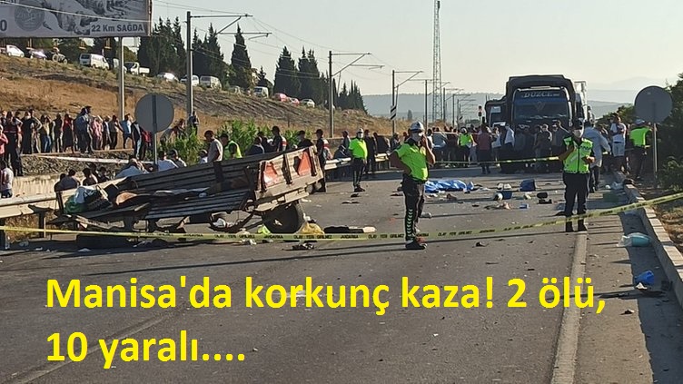 Gelen bir son dakika haberine göre; Manisa’nın Saruhanlı ilçesinde üzüm işçilerini taşıyan traktör ile kamyonet çarpışması sonucu meydana gelen kazda 2 kişi öldü 10 kişi de yaralandı. Çarpışmanın etkisiyle açık kasa traktör römorkunda bulunan üzüm işçileri asfalt yola savrulurken ortalık adeta savaş alanına döndü