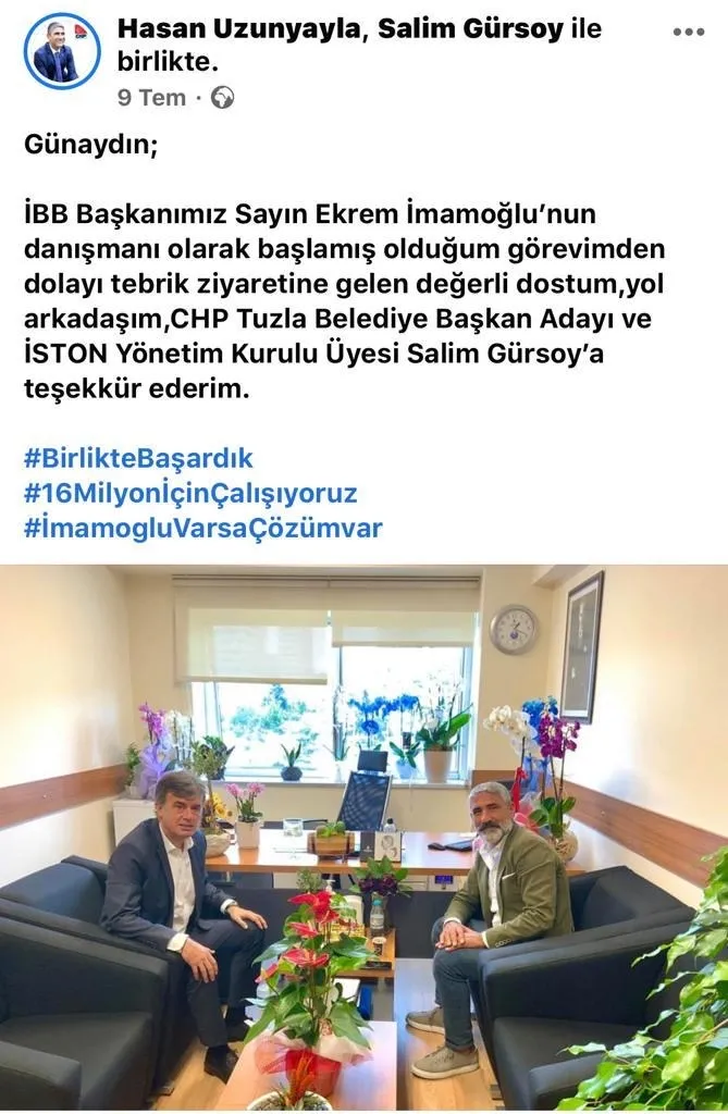 Hasan Uzunyayla; "İBB Başkanımız Sayın Ekrem İmamoğlu'nun danışmanı olarak başlamış olduğum görevimden dolayı tebrik ziyaretine gelen değerli dostum, yol arkadaşım, CHP Tuzla Belediye Başkan Adayı ve İSTON Yönetim Kurulu Üyesi Salim Gürsoy'a teşekkür ederim" ifadelerini kullandı.
