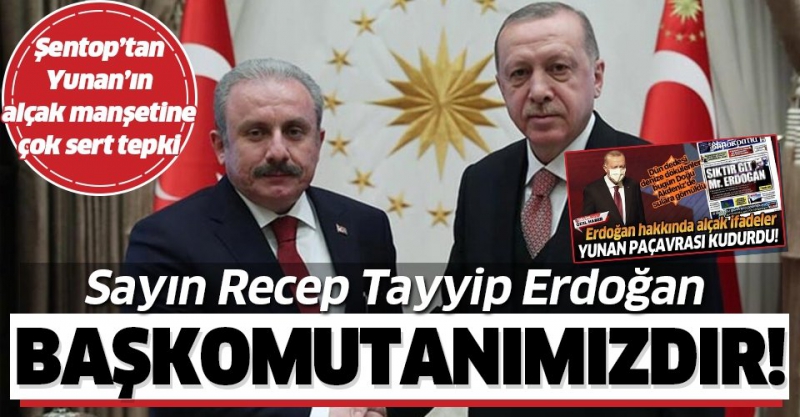 Türkiye Büyük Millet Meclisi Başkanı Prof. Dr. Mustafa Şentop, Yunan basınının Başkan Erdoğan hakkında kullandığı alçak ifadelere tepki gösterdi. Türkiye'nin haklı davasında devam edeceğini belirten Türkiye Büyük Millet Meclisi Başkanı Şentop yaptığı açıklamada, "Sayın Recep Tayyip Erdoğan, Türkiye Cumhurbaşkanıdır; Başkomutanımızdır." ifadelerine yer verdi.