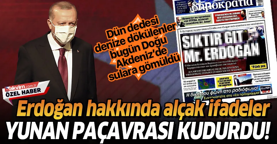 'da yayımlanan "Dimokratia" adlı sözde gazete, bugünkü baş sayfasında Başkan Erdoğan'a çok çirkin ve ağır bir hakarette bulundu. Konuya ilişkin açıklama yapan Yunanistan , herhangi bir yaptırım açıklamazken "Saldırgan dil kullanımı ülkemizin siyasi kültürüne aykırıdır ve ancak kınanabilir." açıklamasıyla yetindi.