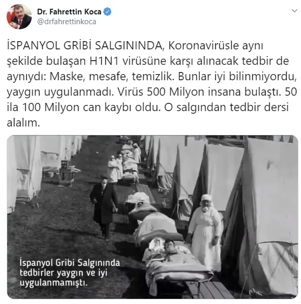 Bakan Koca Twitter hesabından yaptığı açıklamada, "İSPANYOL GRİBİ SALGININDA, Koronavirüsle aynı şekilde bulaşan H1N1 virüsüne karşı alınacak tedbir de aynıydı: Maske, mesafe, temizlik. Bunlar iyi bilinmiyordu, yaygın uygulanmadı. Virüs 500 Milyon insana bulaştı. 50 ila 100 Milyon can kaybı oldu. O salgından tedbir dersi alalım." ifadelerine yer verdi.