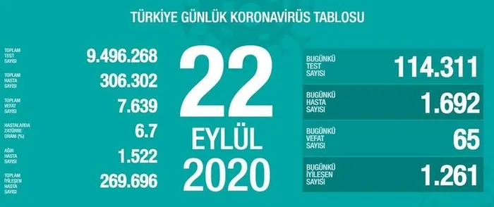 Son 24 saatte 114 bin 311 Kovid-19 testi yapıldı, 1692 kişiye hastalık tanısı konuldu, 65 kişi Kovid-19 nedeniyle hayatını kaybetti, ağır hasta sayısı 1522 oldu, 1261 kişinin Kovid-19 tedavisi tamamlandı.