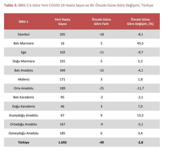 Bir önceki güne göre bölgelerdeki yeni hasta değişim yüzdesine bakıldığında; en fazla azalış Orta Anadolu Bölgesinde (-%11,7) gerçekleşmiştir. En fazla artış ise Batı Marmara Bölgesinde olup hasta sayısı açısından incelendiğinde bu fark sadece 5 hastadır.