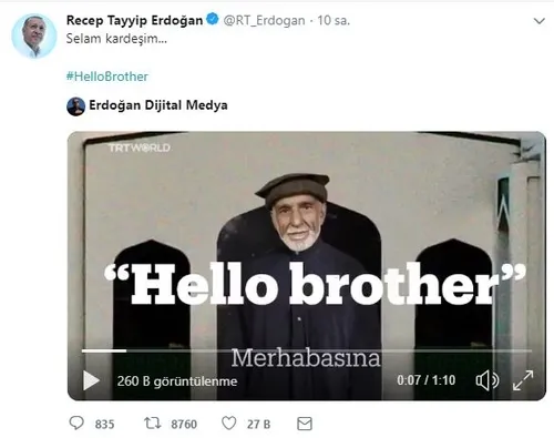 Erdoğan, "Selam kardeşim..." başlığıyla escort-bayan-ilanlari">konak escort bayanğı paylaşımda "#HelloBrother" etiketiyle hazırlanan videoyu paylaştı.