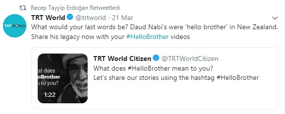 Türkiye Cumhurbaşkanı Recep Tayyip Erdoğan, Yeni Zelanda'da camilere yönelik terör saldırısına tepki olarak başlatılan "Hello Brother" kampanyasına Twitter'dan destek verdi.