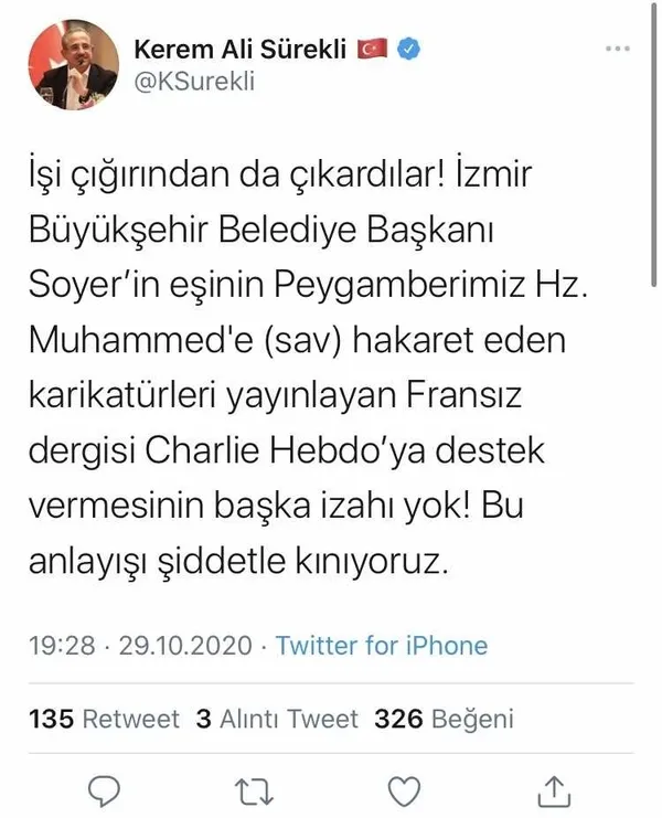 AK Parti İzmir İl Başkanı Kerem Ali Sürekli: "İşi çığırından da çıkardılar! İzmir Büyükşehir Belediye Başkanı Soyer'in eşinin Peygamberimiz Hz. Muhammed'e (sav) hakaret eden karikatürleri yayınlayan Fransız dergisi Charlie Hebdo'ya destek vermesinin başka izahı yok! Bu anlayışı şiddetle kınıyoruz."