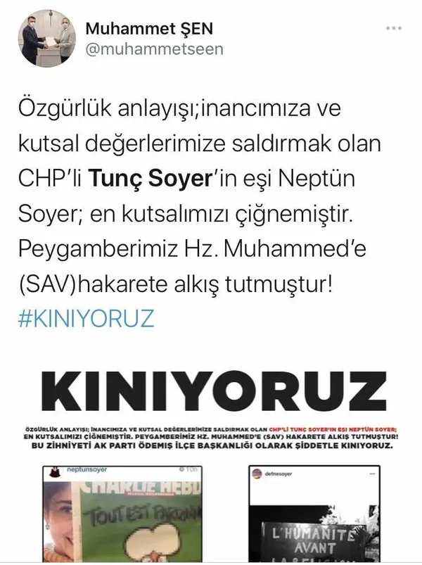 AK Parti Ödemiş İlçe Başkanı Muhammet Şen: "Özgürlük anlayışı; inancımıza ve kutsal değerlerimize saldırmak olan CHP'li Tunç Soyer'in eşi Neptün Soyer; en kutsalımızı çiğnemiştir. Peygamberimiz Hz. Muhammed'e (sav) hakarete alkış tutmuştur! Kınıyoruz.."