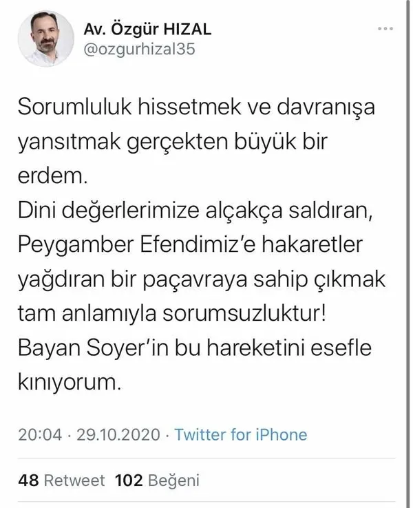 İzmir Büyükşehir Belediyesi AK Parti Grup Başkanvekili Avukat Özgür Hızal: "Sorumluluk hissetmek ve davranışa yansıtmak gerçekten büyük bir erdem. Dini değerlerimize alçakça saldıran, Peygamber Efendimiz'e hakaretler yağdıran bir paçavraya sahip çıkmak tam anlamıyla sorumsuzluktur! Bayan Soyer'in bu hareketini esefle kınıyorum."