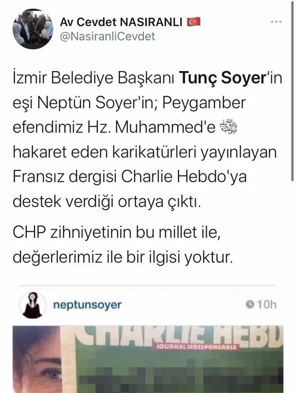 ASKON Diyarbakır Başkanı avukat Cevdet Nasıranlı: "İzmir Belediye Başkanı Tunç Soyer'in eşi Neptün Soyer'in; Peygamber efendimiz Hz. Muhammed'e hakaret eden karikatürleri yayınlayan Fransız dergisi Charlie Hebdo'ya destek verdiği ortaya çıktı. CHP zihniyetinin bu millet ile değerlerimiz ile bir ilgisi yoktur."