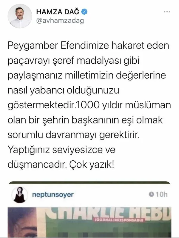 AK Parti Genel Başkan Yardımcısı ve İzmir Milletvekili Hamza Dağ: "Peygamber Efendimize hakaret eden paçavrayı şeref madalyası gibi paylaşmanız milletimizin değerlerine nasıl yabancı olduğunuzu göstermektedir.1000 yıldır müslüman olan bir şehrin başkanının eşi olmak sorumlu davranmayı gerektirir. Yaptığınız seviyesizce ve düşmancadır. Çok yazık!"