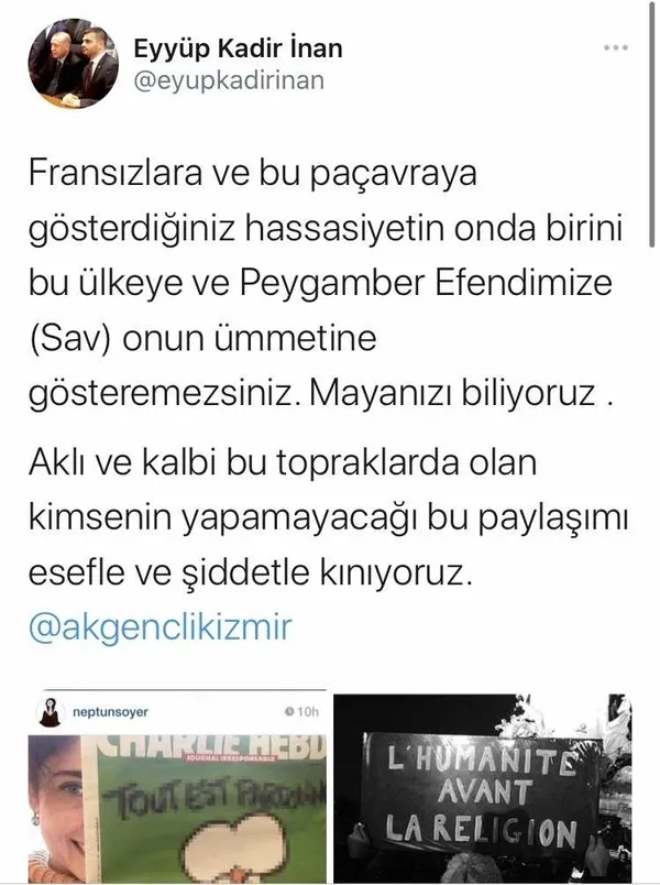 AK Parti İzmir İl Gençlik Kolları Başkanı Eyyüp Kadir İnan: "Fransızlara ve bu paçavraya gösterdiğiniz hassasiyetin onda birini bu ülkeye ve Peygamber Efendimize (sav) onun ümmetine gösteremezsiniz. Mayanızı biliyoruz. Aklı ve kalbi bu topraklarda olan kimsenin yapamayacağı bu paylaşımı esefle ve şiddetle kınıyoruz."