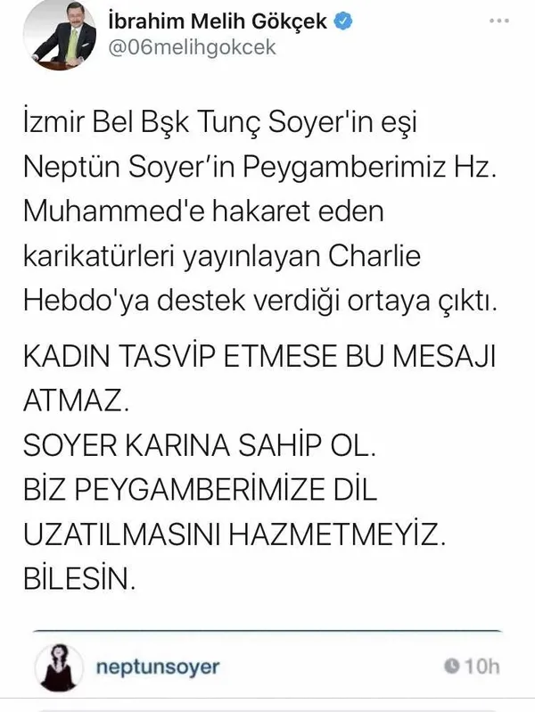 Ankara Büyükşehir Belediye Eski Başkanı Melih Gökçek: "İzmir Belediye Başkanı Tunç Soyer'in eşi Neptün Soyer'in Peygamberimiz Hz. Muhammed'e hakaret eden karikatürleri yayınlayan Charlie Hebdo'ya destek verdiği ortaya çıktı. Kadın tasvip etmese bu mesajı atmaz. Soyer karına sahip ol. Biz Peygamberimize dil uzatılmasını hazmetmeyiz. Bilesin."