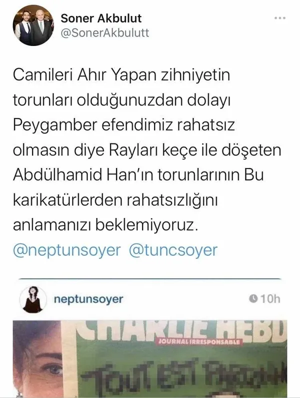 AK Parti Bayraklı Gençlik Kolları Başkanı Soner Akbulut: "Camileri ahır yapan zihniyetin torunları olduğunuzdan dolayı Peygamber efendimiz rahatsız olmasın diye rayları keçe ile döşeten Abdülhamid Han'ın torunlarının bu karikatürlerden rahatsızlığını anlamanızı beklemiyoruz.."