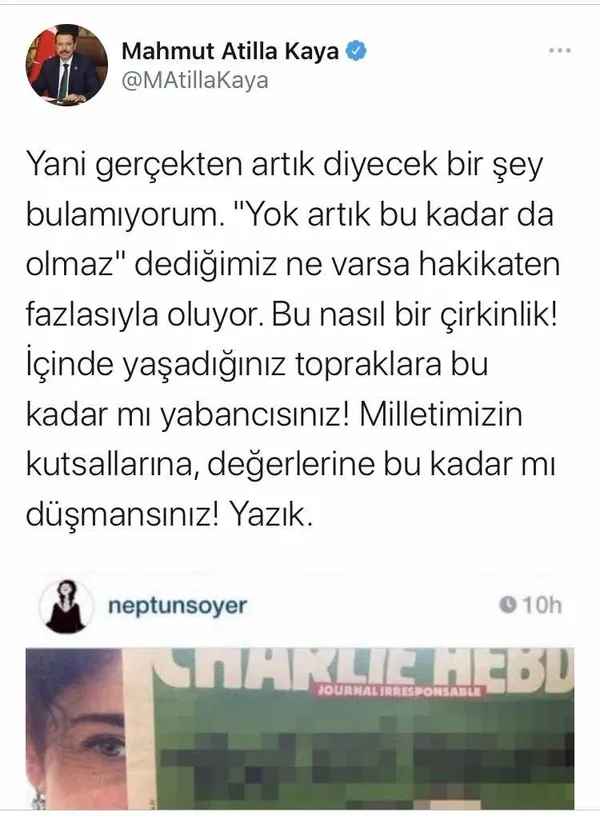 AK Parti MKYK Üyesi ve İzmir Milletvekili Mahmut Atilla Kaya: "Yani gerçekten artık diyecek bir şey bulamıyorum. 'Yok artık bu kadar da olmaz' dediğimiz ne varsa hakikaten fazlasıyla oluyor. Bu nasıl bir çirkinlik! İçinde yaşadığınız topraklara bu kadar mı yabancısınız! Milletimizin kutsallarına, değerlerine bu kadar mı düşmansınız! Yazık."