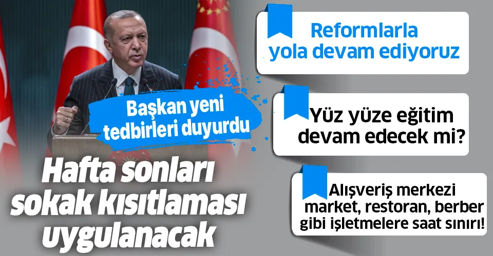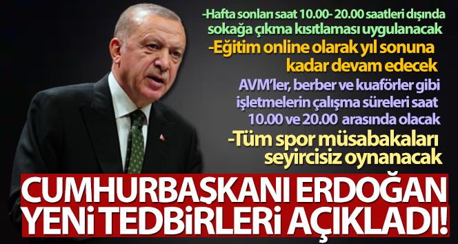 Son dakika: Cumhurbaşkanlığı Kabinesi Toplantısı sonrası Başkan Erdoğan, Koronavirüs (Covid-19) tedbirleri kapsamında alınan son dakika yeni tedbirleri tek tek açıkladı. Erdoğan uzaktan eğitimin yıl sonuna kadar devam edeceğini, hafta sonu sokağa çıkma kısıtlamasının 10.00 ile 20.00 saatleri arası dışında uygulanacağını duyurdu.